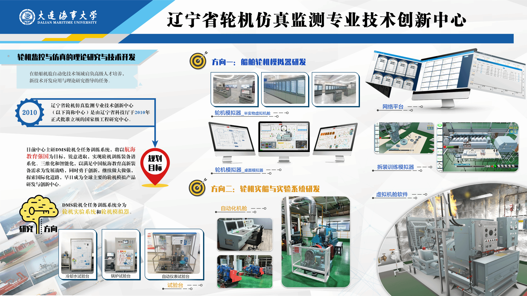 辽宁省轮机仿真监测专业技术创新中心(以下简称中心)是由辽宁省科技厅于2010年正式批准立项的国家级工程研究中心。中心主要从事轮机监控与仿真的理论研究与技术开发工作,在船舶机舱自动化技术领域肩负高级人才培养,新技术开发应用与理论研究指导的任务。