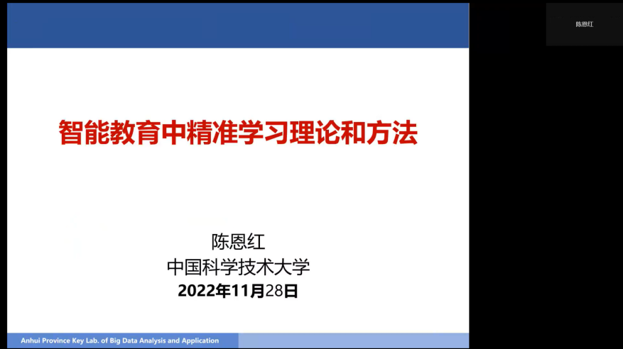 赠送仪式后,陈恩红教授作题为“智能教育中的精准学习理论与方法”的报告。他表示,当今教育形式正在悄然发生着变化,这种变化带来了教育大数据的迅猛增长,大数据时代走向智慧教育。尽管传统教育面临了很多难题,数字化、智能化教育仍可以对部分问题加以改变。在报告期间,他介绍了主要研究工作与应用成果,并进行了总结与讨论。