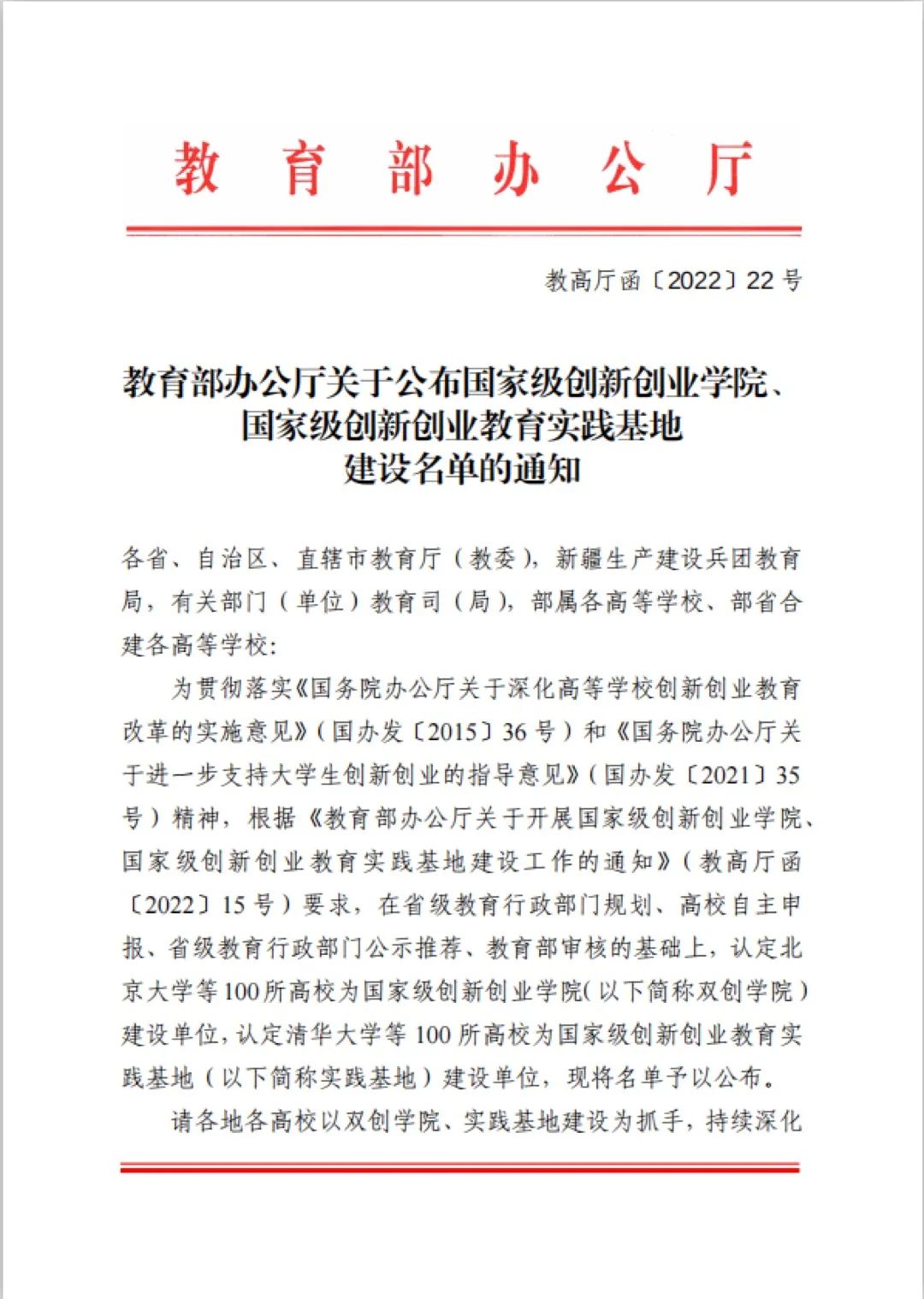 近日,教育部办公厅发布了《关于公布国家级创新创业学院、国家级创新创业教育实践基地建设名单的通知》(教高厅函〔2022〕22号),欧亿体育·(中国)官方网站获首批“国家级创新创业教育实践基地”建设单位。这是我校继2019年获评全国创新创业典型经验高校(50强)、2020年Hi-C空间获国家级众创空间之后,持续推进创新创业教育改革工作获得的又一国家级殊荣!