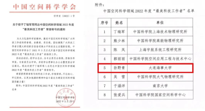 经中国空间科学国家一级学会下属共12个专业委员会推荐,中国空间科学专家委员会评审,我校环境科学与工程学院的孙野青教授作为空间生命专业委员会唯一入选人,荣获中国空间科学学会授予的中国空间科学领域2022年度“最美科技工作者”荣誉称号。