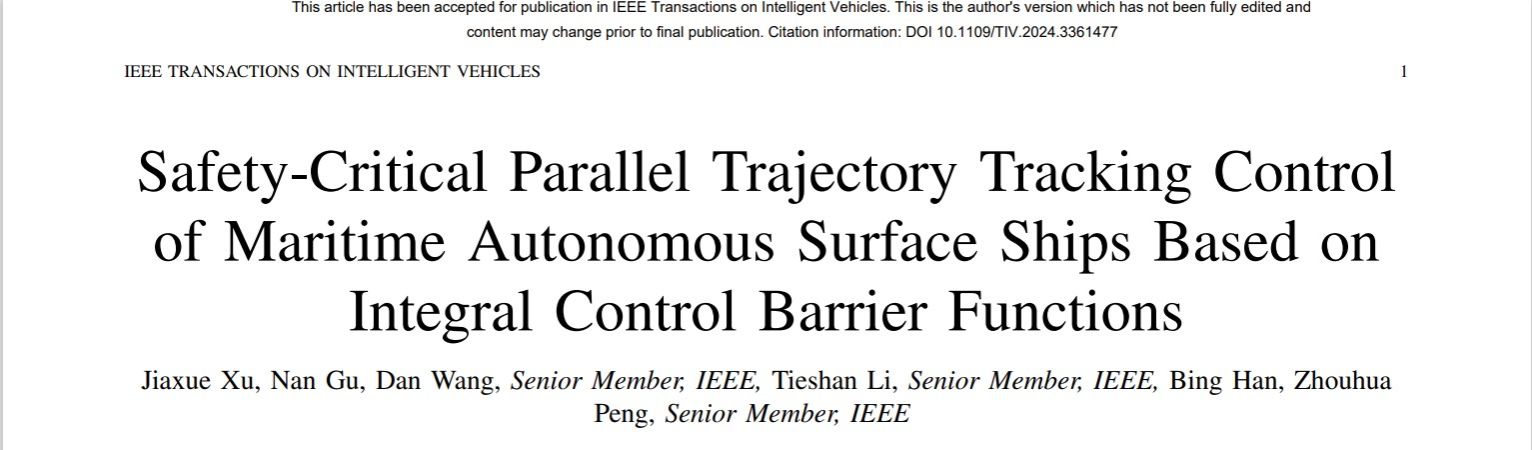 近日,欧亿体育·(中国)官方网站船舶电气工程学院彭周华教授团队在交通科学技术领域权威期刊《IEEE Transactions on Intelligent Vehicles》上发表了题为“基于积分控制障碍函数的智能船舶安全平行轨迹跟踪控制”(Safety-Critical Parallel Trajectory Tracking Control of Maritime Autonomous Surface Ships Based on Integral Control Barrier Functions)的论文。