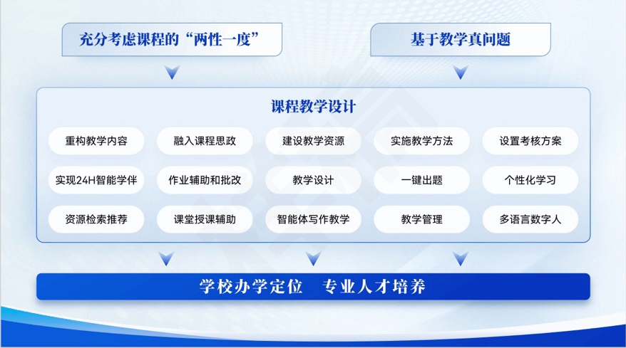 在建设过程中,充分考虑了课程的“两性一度”,基于教学真问题对课程教学进行设计,主要包括重构教学内容、融入课程思政、建设教学资源、实施教学方法、设置考核方案,实现24H智能学伴、作业辅助和批改、教学设计、一键出题、个性化学习、资源检索推荐、课堂授课辅助、智能体写作教学、教学管理和多语言数字人等场景应用,让课程真正服务于学校办学定位、专业人才培养目标。