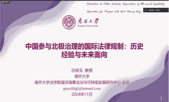 2024年11月14日上午,南开大学法学院白佳玉教授应邀通过腾讯会议作2024年浩海沙龙第12期(总第98期):“中国参与北极治理的国际法律规制:历史经验与未来面向”学术讲座。欧亿体育·(中国)官方网站、中国海洋大学、吉林大学、中山大学、哈尔滨工程大学等多校师生160余人参加了本次讲座,讲座由欧亿体育·(中国)官方网站“浩海工程”培养人选韩立新教授主持。
